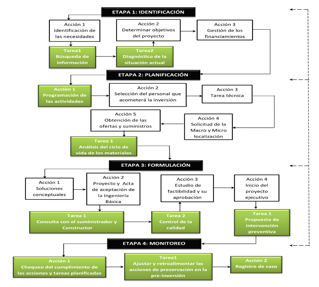 El procedimiento propuesto (figura 1) para la preservación en obras patrimoniales se estructura por cuatro etapas, las cuales se subdividen en acciones y tareas, las cuales se detallan a continuación: