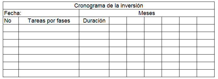 Se pasa a establecer el tiempo de duración en meses de las diferentes tareas que se prevén desarrollar desde la fase de pre-inversión hasta la fase de desactivación y puesta en explotación; con el objetivo de controlar el desarrollo de la inversión.