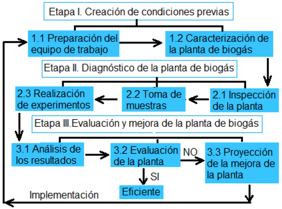 El objetivo de esta etapa es detectar las principales potencialidades y deficiencias del funcionamiento de la planta en la disminución de la carga contaminante de los residuales y la producción de biogás. En este sentido, el diagnóstico permite definir el estado real que tiene la instalación, así como el conocimiento de especialistas, técnicos, productores y operarios. Esta etapa se compone por tres pasos y ocho acciones.