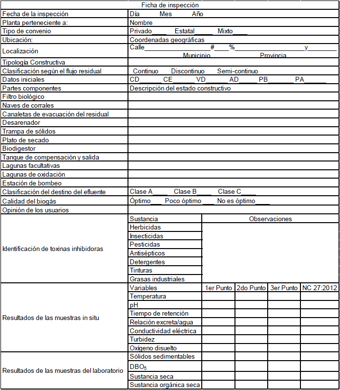 La caracterización debe tener una descripción general de la planta de biogás referente a la tipología constructiva, la ubicación, los datos iniciales y la clasificación. En cuanto a la tipología, esta comprende las arquitectónicas, las industriales y las ingenieriles. La ubicación determina si se encuentran en zonas urbanas o rurales y su localización. Los datos iniciales contribuyen a tener conocimiento sobre cantidad de cerdos existentes (CE), cantidad de cerdos de diseño (CD), volumen del digestor (VD), abasto diario de agua utilizada para el baldeo (AD), producción de biogás (PB) y producción de abono (PA). Según la clasificación pueden ser continuas, semi-continuas y discontinuas. Se ha confeccionado la ficha técnica que se ilustra en la tabla 1, la cual facilita la inspección en el lugar. La información se completará a medida que se apliquen los pasos y acciones del procedimiento.
