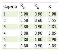 A partir de los resultados de la Tabla 2 y cumpliendo con el procedimiento se selecciona a los expertos que demostraron poseer un mayor coeficiente de competencia mayor que 0.80 (1, 3, 4, 5 y 6).