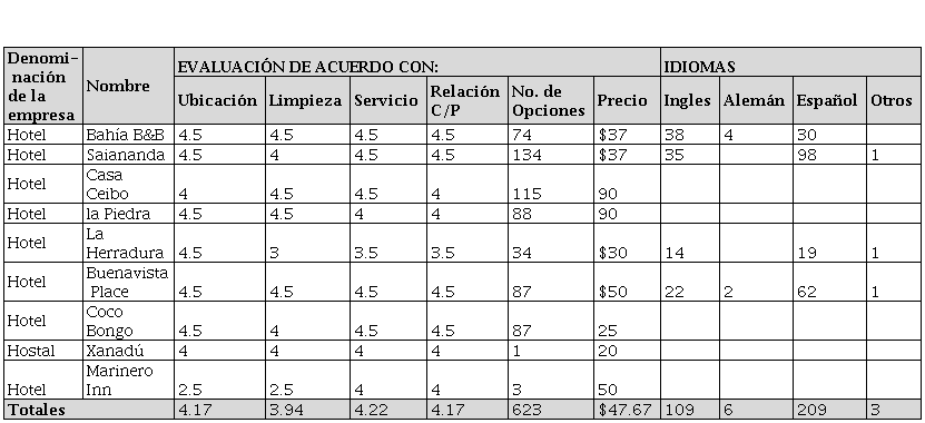 De acuerdo a la tabla se puede decir que el hotel con mayor opiniones es el Saiananda con 134 opiniones y con puntuación muy buena en todos los aspectos calificados, en segundo lugar se encuentra el hotel Casa Ceibo con un total de 115 comentarios positivos, con puntuaciones desde 4 a 4,5 que refleja una buen posicionamiento y en uno lo de los últimos lugares en el área hotelera se encuentra el Hostal Xanadú ubicados en Bahía de Caráquez con tan solo una opinión lo cual le dio una nota de 4 en todos los parámetros evaluado.