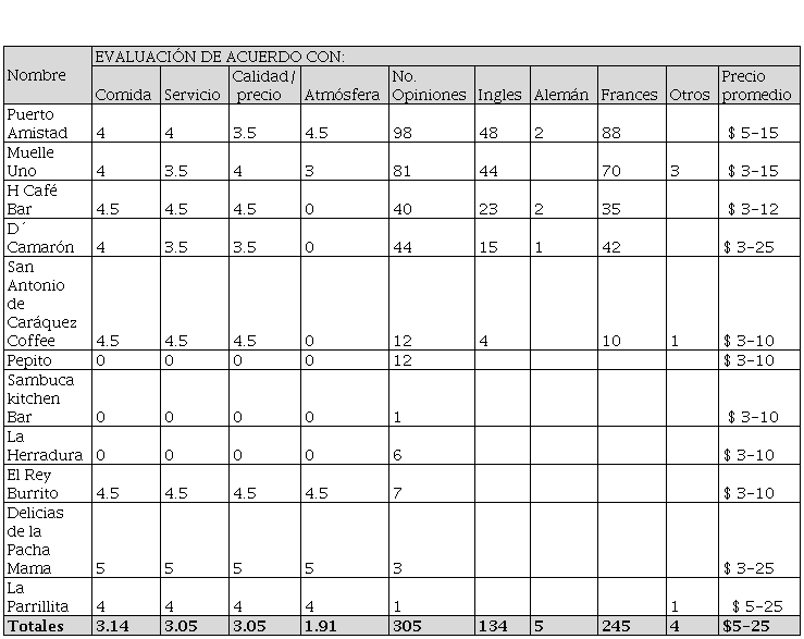 De acuerdo con la tabla se puede observar los restaurantes que se encuentra en Bahía donde el más representativo y con mayor reconocimiento es Puerto Amistad con 98 opiniones muy buena y con calificaciones otorgadas por clientes que consume su servicio, entre el menos reconocido es el Sambuca Bar por ser uno de los últimos en brindar su servicio en el mercado.