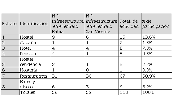 De acuerdo a la investigación tenemos los siguientes resultados, se pudo observar que Hostal tiene un 13.6% de participación en el mercado con 9 en el estrato de Bahía y un 6 en San Vicente da como resultado un 15 en punto en su total de actividades, mientras que Cabaña cuenta con un 1 en estrato Bahía y 1 en San Vicente, 2 en el total de participación da como resultado un 1.8% en la participación, los Hotel tiene un 7.3% de partición que en el estrato de Bahía es de 4 y 4 en San Vicente y en el total de participación con 8 como suma de los dos destino, en Pensión un 4.5% de participación con el 4 en Bahía y 1 en San Vicente y 5 en total de participación, en Hostal de Residencia el 2.7 % de participación con 2 de estrato en Bahía y 1 en San Vicente con un total de 3 en la actividad.