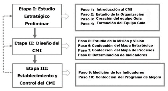 El objetivo del procedimiento de Soler González (2009) es establecer los pasos necesarios para implementar el CMI contextualizado en las empresas cubanas, según muestra la figura 1. El procedimiento es flexible de acuerdo con las características de la empresa cubana y tiene la particularidad de estar vinculado a las actividades de comunicación y control mediante las herramientas informáticas que se adaptan a las particularidades empresariales. La primera etapa cuenta con cuatro pasos, la segunda con tres pasos y la tercera con dos.