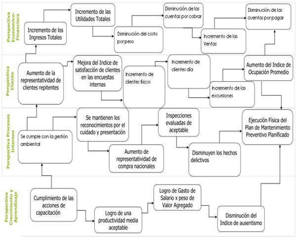 En la figura 2, que aparece a continuación se reflejan las cuatro perspectivas que se consideran en la construcción del Mapa Estratégico. Las perspectivas empresariales definidas fueron Económico-Financiera: se identifica en la UEB, las consecuencias y resultados económicos, revela eficiencia y eficacia en la gestión. En la perspectiva de Clientes: se identifica los requisitos y la satisfacción de todos los clientes, así como la repitencia que asegura una categoría superior a largo plazo.