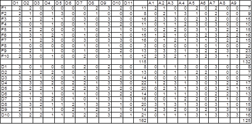 Para la elaboración de la Matriz DAFO por impactos se agruparon por filas los factores internos y por columna los externos; posteriormente se puntuaron los impactos entre ellos asignándole valores entre 0 (no existe impacto) y 3 (mayor impacto). Los resultados sitúan a INGECO en el cuadrante DO, por lo que debe aplicar estrategias adaptativas y aprovechar las oportunidades para eliminar sus debilidades.