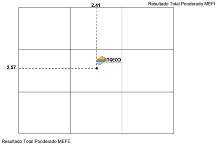 Seguidamente, se confeccionó la Matriz Interna – Externa, esta ubicó a INGECO en el cuadrante V, debe adoptar estrategias de resistencia que le permitan aprovechar mejor sus fortalezas y oportunidades.