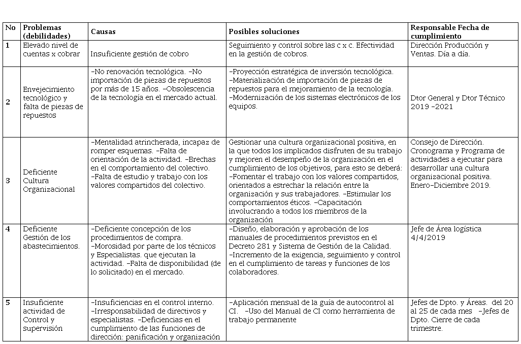 A continuación, se expone el diagnóstico realizado en la Gráfica “Haydeé Santamaría”, donde se definen los 5 problemas o debilidades fundamentales que hoy afectan el buen desempeño de la organización y sobre los que debe caer el peso del plan de acción (ver Tabla 1) para enfrentarlas y erradicarlas: