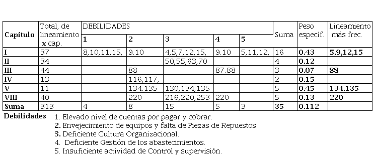 De los 313 lineamientos totales, 35 se relacionan con las debilidades fundamentales, para 11% de relación con los Lineamientos. El capítulo I “Modelo de gestión Económica” es el de mayor incidencia, pues de 37 lineamientos 16 tienen relación con las debilidades; 14 de los Lineamientos Generales y 2 de la Esfera Empresarial. Con la debilidad más fuerte de la Organización que es la deficiente cultura organizacional se relacionan la mayor cantidad de Lineamientos: 15 para un 43% de los 35 totales. (Ver tabla 2).