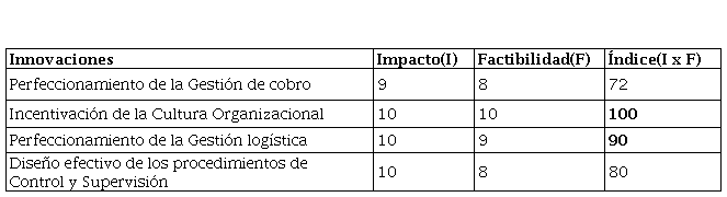 Con el propósito de identificar dentro de las innovaciones la de mayor índice de impacto y factibilidad, según el criterio del grupo experto, se aplicó la siguiente matriz (ver tabla 3) que resume el consenso de las valoraciones: