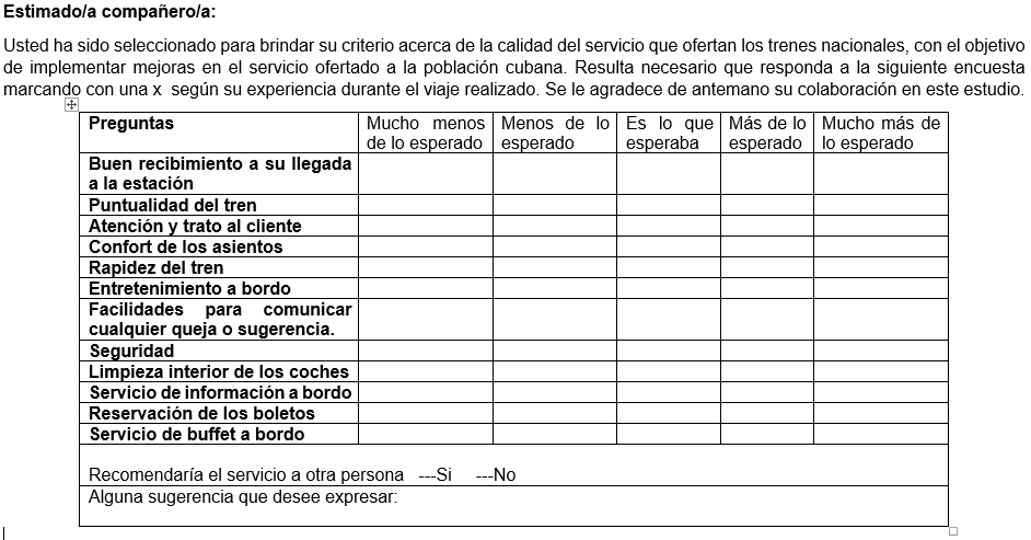 Para ello, se empleó el método no probabilístico por conveniencia, dada las características del flujo de clientes en la estación y se seleccionan aquellos de mayor afluencia. Asignarle a cada una de las casillas de la escala de valores de 1 a 5 de la manera siguiente:
