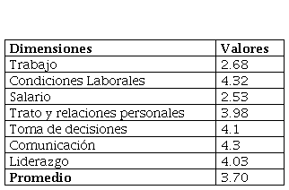 Los atributos que presentan mayor influencia resultan: trabajo y salario con valores de 2.68 y 2.53 respectivamente. Es importante ejecutar acciones para mejorar los valores de las dimensiones con problemas, ya que descuidarlas puede ocasionar la desmotivación del cliente interno e influir directamente en el desempeño de los procesos y en la disminución del nivel de calidad del servicio.