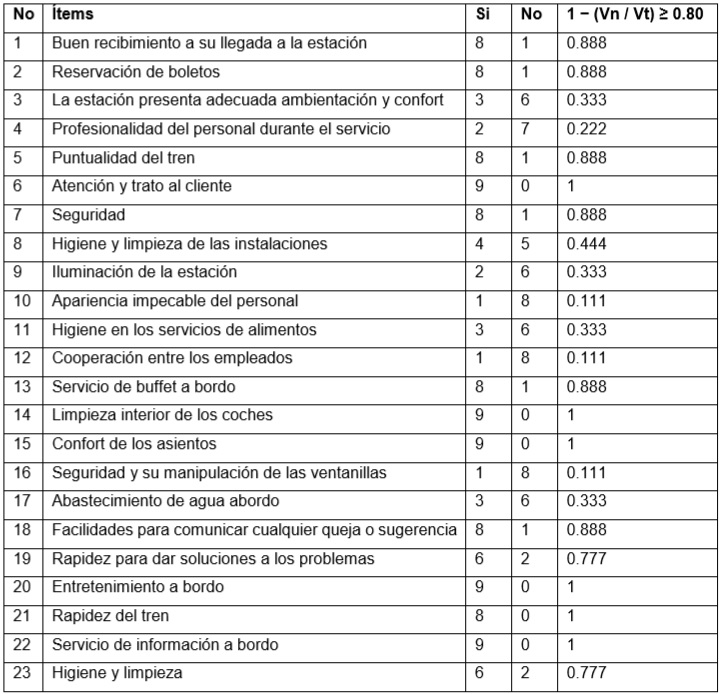 La tabla 1 muestra el resultado del criterio de cada experto sobre el ítem que ellos consideraron que deben conformar la encuesta a partir de los votos negativos: 1 − (Vn / Vt) ≥ 0.80.