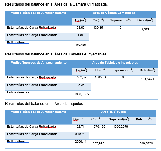 Se realiza un balance para indagar si existe correspondencia entre la capacidad de almacenamiento y la demanda en el cual se pudo constatar que existe incapacidad de almacenamiento en las áreas de líquidos, tabletas e inyectables y la cámara climatizada, es decir que la capacidad de almacenamiento en dichas áreas no cubre la demanda de este servicio como se puede observar en las siguientes tablas.