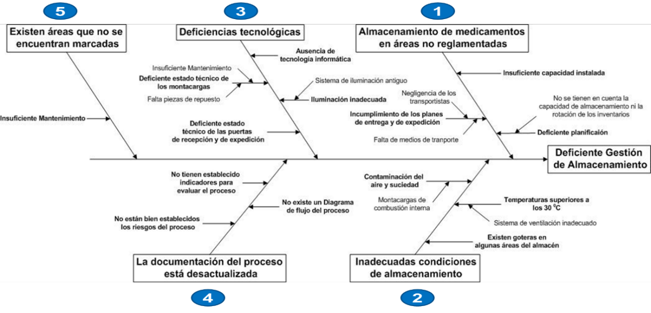 El estudio realizado en el Centro de Distribución San José arrojó que la causa principal que incide en la deficiente Gestión de Almacenes es la colocación de medicamentos en áreas no reglamentadas, seguido de las inadecuadas condiciones de almacenamiento, las deficiencias tecnológicas, la desactualización de la documentación del proceso y la existencia de áreas no marcadas.