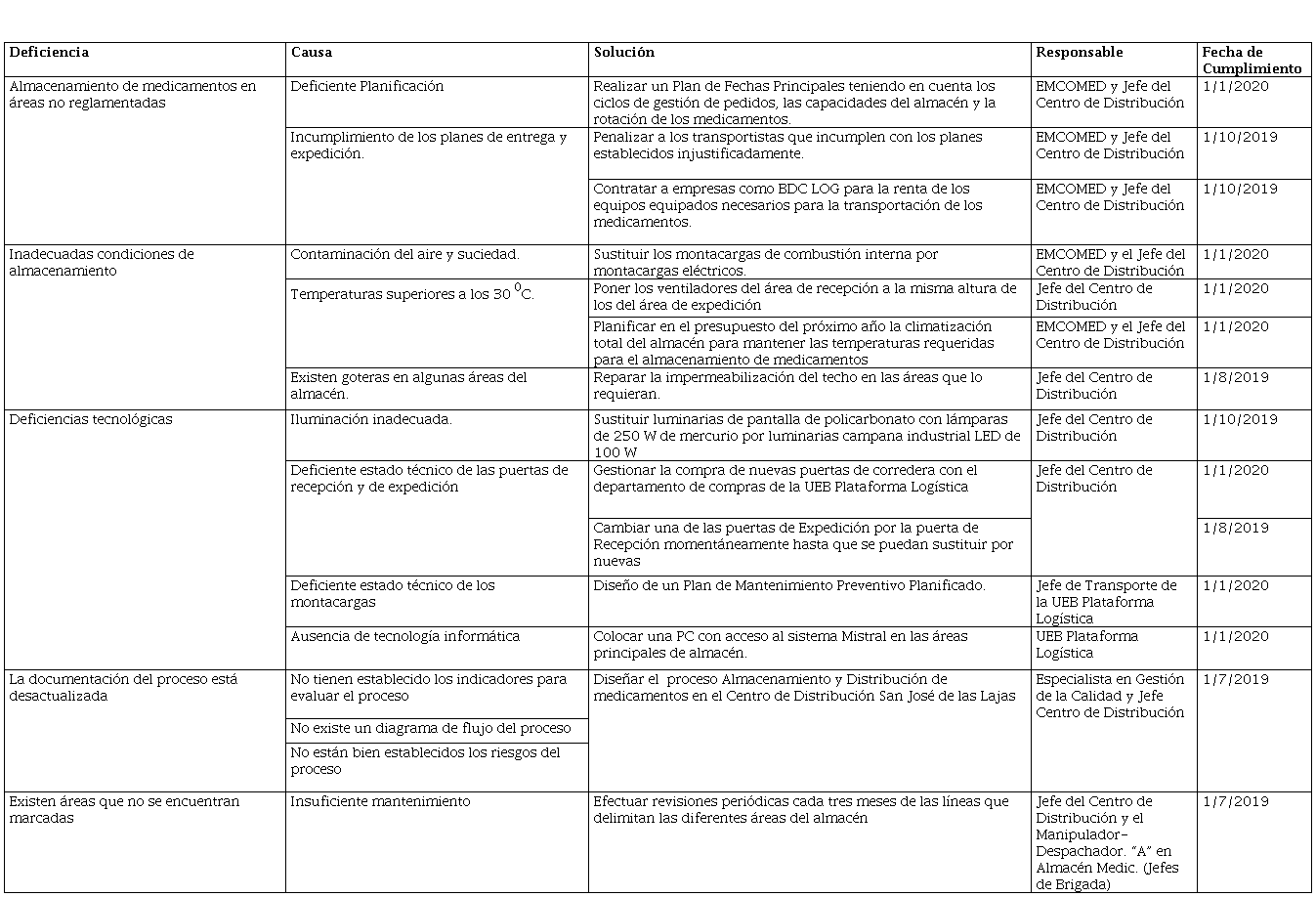 Se debe destacar que, a partir de un debate con los expertos y trabajadores del almacén, se elaboran propuestas de soluciones contempladas en el siguiente plan de mejoras, el cual quedó aprobado por el consejo de dirección del Centro de Distribución San José de las Lajas.
