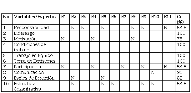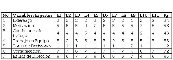 Los resultados finales de acuerdo al valor obtenido de los Rj media permiten establecer un orden de prioridad, para el tiramiento de las variables identificadas; se hace también recalcular los coeficientes de concordancias (Cc), que necesariamente no tienen que corresponder con los referidos en la tabla 2; tal y como sigue: toma de decisiones, liderazgo, trabajo en equipo, condiciones de trabajo, motivación, estilos de dirección y comunicación; para un Rij media: de 1.09, 2.18, 3.00, 3.91, 5.27, 6.00 y 6.55 y un Cc: de 63.6, 72.7, 81.8, 72.7, 90.9, 63.6 y 72.7 respectivamente.