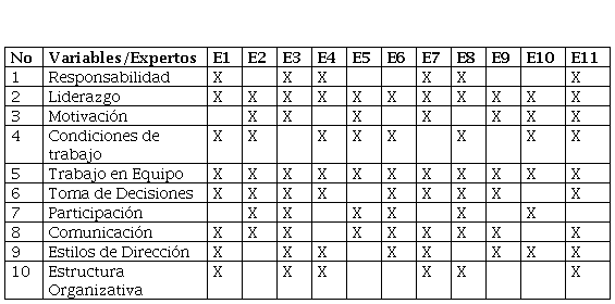 1. Se realiza la primera ronda donde los expertos plasman en un papel las variables que consideran afectan el clima organizacional en el área caracterizada. En la Tabla 1 se muestran los resultados obtenidos.