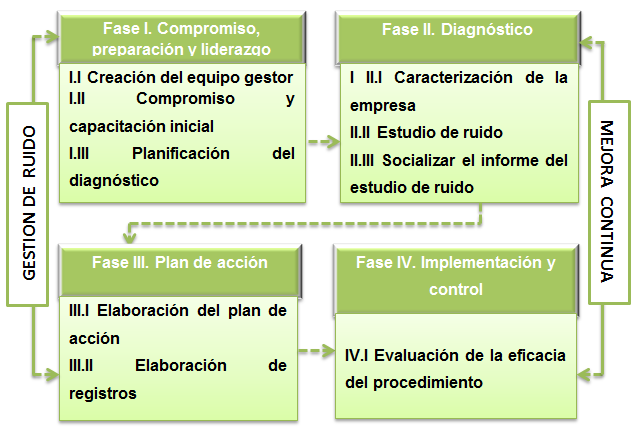 En el procedimiento tiene un enfoque sistémico y el Ciclo PHVA (planear, hacer, verificar y actuar) de Shewhart, para obtener la mejora y fortalecer la gestión de ruido. El mismo puede ser implantado satisfactoriamente si están presentes las condiciones de partida siguientes:
