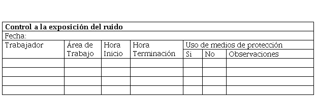 Se deben elaborar registros que evidencien el monitoreo y control del desempeño de la gestión de ruido en la entidad. Los mismos deben evidenciar el control a la exposición del ruido de cada trabajador, así como las horas trabajadas y el uso de los medios de protección. Ver tabla 1.