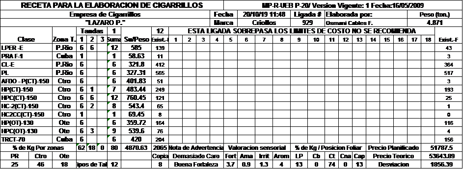 En la tabla No.1 se ejemplifica una receta para la elaboración de cigarrillo, resultante de la sustitución de clases en correspondencia con la caracterización de la materia prima explicada anteriormente: