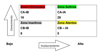 De esta acción resultó, que en el I cuadrante se sitúan un total de dieciséis (16) PI Informadas, que se caracterizan por mantenerse un alto nivel de conocimiento en torno al proyecto “Palmar de Junco”, sin embargo, no logran implicarse suficientemente en las proyecciones de la futura empresa a pesar de reconocer los beneficios que ello reportaría. En el cuadrante II permanecen las PI Activas veinte y ocho (28), las cuales no solo tiene un alto conocimiento sobre el proyecto y sus líneas de desarrollo para transitar hacia una EBT, sino que además tienen una alta implicación y colaboración con tal empeño. En otra posición se sitúan las PI Inactivas, ocho (8), que a pesar de la importancia que revisten para el proyecto y los beneficios que ofrece la EBT para su alcance y desarrollo, no se disponen a tener conocimiento ni la implicación necesaria en torno a la propuesta.