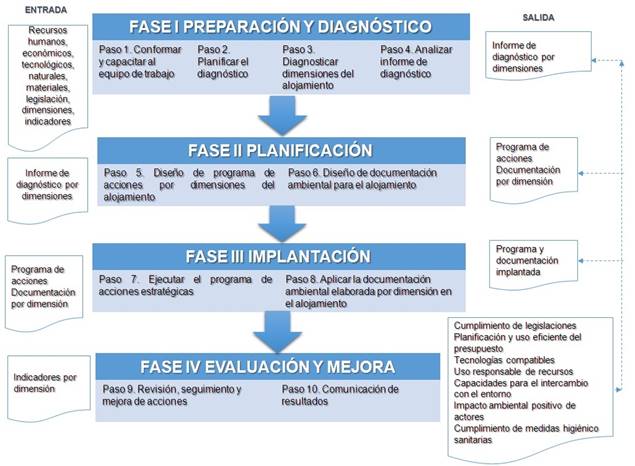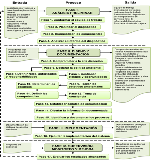 En el hotel se identifican como principales fuentes de contaminación por productos químicos y desechos peligrosos derivados de los productos de limpieza y fregado, del control de vectores, y del mantenimiento al equipamiento de climatización y refrigeración. Persiste la falta de experiencia del personal, escasa capacitación ambiental, así como la inefectividad en el cumplimiento de las legislaciones y regulaciones asociadas al manejo de residuos sólidos y tratamiento de residuos líquidos. Para resolver la problemática identificado se diseñó un procedimiento, ver figura 1, para la gestión ambiental que consta de cuatro fases, diecisiete pasos y tareas.