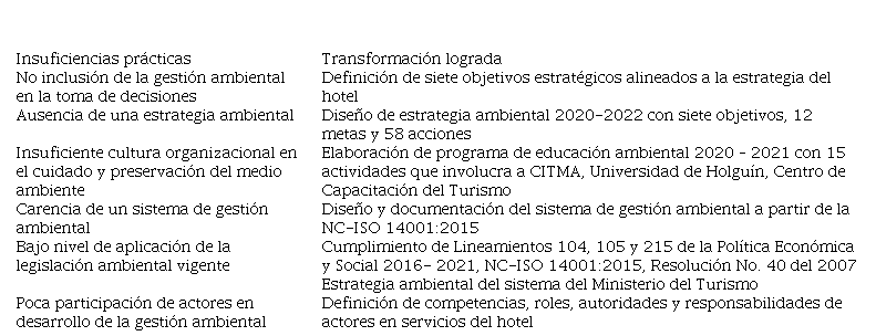 De forma general la aplicación parcial del procedimiento en ambos casos permitió transformar la problemática identificada al: incrementar el conocimiento de aspectos ambientales, en particular, en el hotel Ordoño se hizo énfasis en las normativas asociadas a las condiciones laborales necesarias para ejercer la labor de los camareros de habitaciones; sensibilizar a directivos y trabajadores acerca de las consecuencias que ocasionan las inadecuadas prácticas ambientales en el proceso de gestión del alojamiento; profundizar en el análisis de la relación aspecto- impacto ambiental en la gestión del alojamiento y en las causas fundamentales que generan impactos ambientales negativos en el medio ambiente laboral; incorporar los protocolos establecidos para el enfrentamiento a la pandemia COVID-19 en establecimiento turísticos, lo que realza la propuesta de una nueva dimensión en la gestión ambiental de hoteles: la higiénico- sanitaria; y Reforzar las medidas de ahorro de portadores energéticos y la gestión de residuos sólidos, lo que contribuye a objetivos concretos de la Agenda de las Naciones Unidas para el desarrollo sostenible.