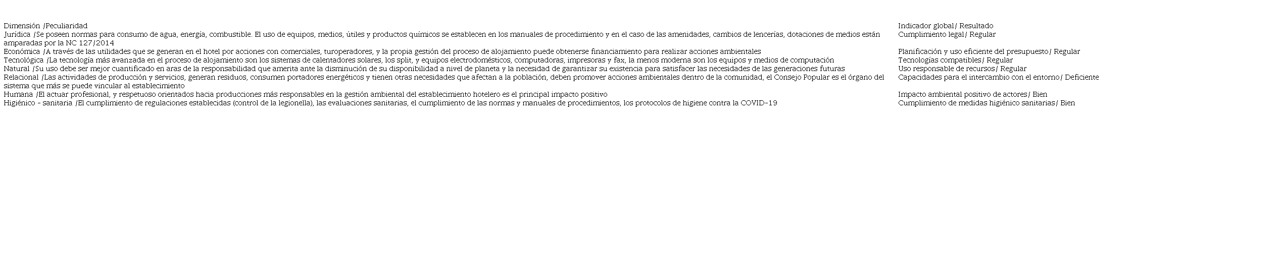 De lo anterior se comprueba que existen limitaciones en la concepción teórica y metodológica para la gestión ambiental en servicios hoteleros, lo que no permite su aplicación en hoteles Encanto. Un acercamiento a la gestión ambiental en los hoteles Encanto en el destino Holguín, mediante el intercambio con su alta dirección, la revisión de documentos y la observación científica, en el período de enero a marzo de 2020, reveló que se trabaja en la aplicación de buenas prácticas para mitigar los impactos negativos que causa la actividad hotelera sobre el medio ambiente, no obstante, se manifestaban las insuficiencias siguientes:
