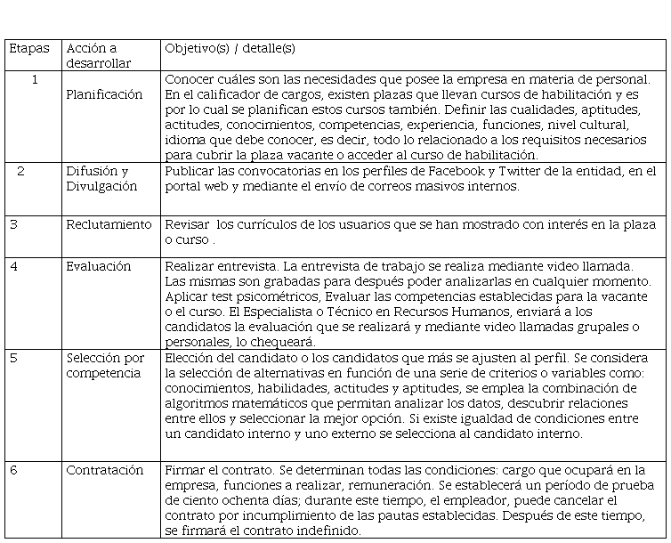 Abstract: Current technology allows us to have tools that facilitate the management of human talent; such is the case of recruitment for the selection of personnel online, which the authors highlight as a step beyond traditional recruitment. The present investigation was carried out at the Cuban Telecommunications Company, ETECSA, in Artemisa, with the aim of proposing a procedure that contributes to managing the recruitment and selection process of candidates online. To carry out the work, methods such as: observation, survey and interviews were used, to diagnose the current procedure; induction-deduction was used in determining the design of the procedure that is proposed as a new tool to manage human resources. The simulation of the procedure was carried out, which demonstrates its feasibility, simplifies tasks and eliminates activities and reduces the days from planning to hiring candidates.