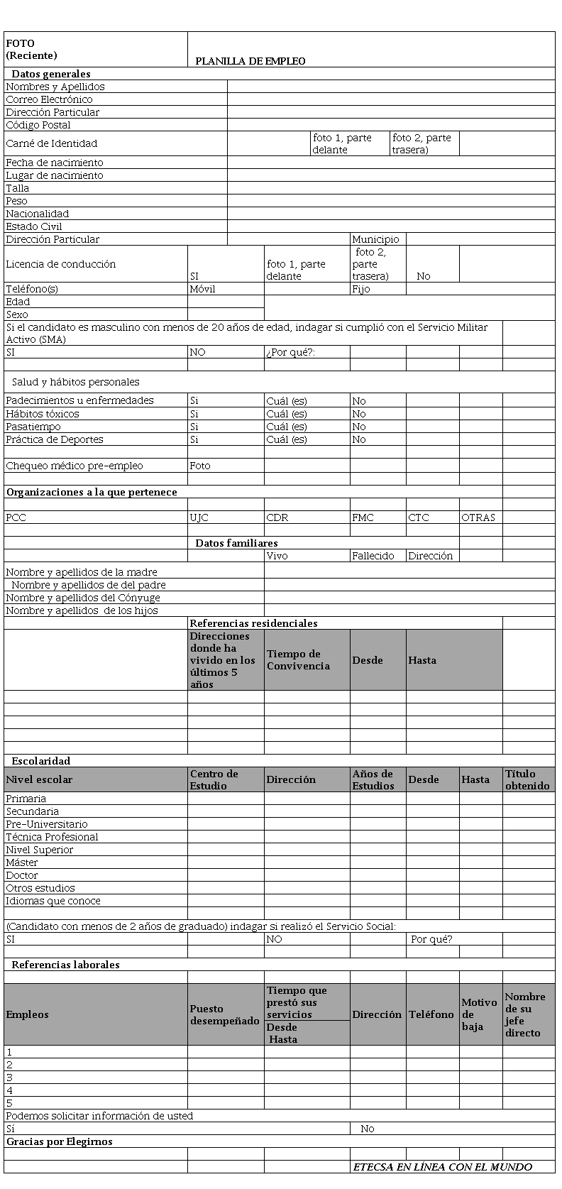Los modelos anteriormente mencionados, que hoy deben recoger los candidatos y entregar posteriormente de su llenado, se unificaron en una única planilla que se presenta en la Tabla 1. Planilla de Empleo. La misma puede ser enviada a solicitud de los aspirantes mediante correo electrónico u otros canales de comunicación y recibidos en la entidad, de la misma manera, en formato PDF.