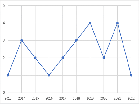 En la figura 1 se observa el comportamiento de la producción sobre el tema en el período seleccionado. En 2013 se realizó la primera publicación (Responsabilidad Social Empresarial en pequeñas y medianas empresas turísticas. Evidencia de Europa y América Latina). Al siguiente año se realizaron 3 publicaciones, siendo este uno de los años de mayor productividad, sin embargo, en 2015 y 2016 la productividad desciende. A partir de 2017 las publicaciones aumentan a un ritmo de 1 anual hasta el año 2019, uno de los años más productivos. En 2020 se observa un descenso considerable en relación al año anterior, con 2 y 4 publicaciones respectivamente. En 2021 se aprecia una recuperación, sin embargo, durante la parte analizada del año 2022 solo se reporta 1 publicación.