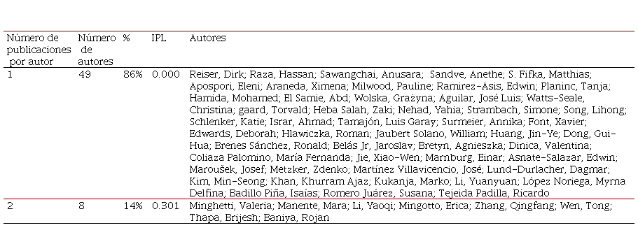 De las 23 publicaciones se identificó un total de 57 autores. Para evaluar la productividad por autor (tabla 1) se empleó el índice de productividad de Lotka (IPL), que equivale a la expresión matemática IPL=logn, donde n= número de publicaciones. Luego del análisis se determinó que el 86% de los autores tiene un IPL= 0; mientras que el 14% tiene un IPL=0.301.
