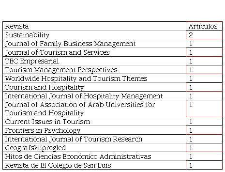 En la tabla 2 se observan las revistas donde se han publicado los artículos. Estos se encuentran dispersos en un total de 15 revistas; de ellas solo la revista Sustainability ha publicado más de 1 artículo.