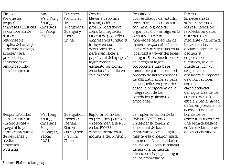 La revisión de los artículos relacionados con la temática definida permitió identificar un conjunto de brechas en los mismos. Ambos estudios (Wen et al., 2020; Wen et al., 2021) se realizaron en ciudades de China, y los instrumentos empleados para colectar datos se basan en las declaraciones de los empresarios, lo que pudiese inducir un sesgo de deseabilidad social al dar respuestas que consideren más deseables o aceptables socialmente (Grimm, 2010). Asimismo, no se consideró el impacto de las características demográficas de los empresarios como su origen, sexo o educación, y características de las empresas como el tiempo de operación o escala, lo que puede influir en el vínculo y apego de los empresarios con las comunidades.