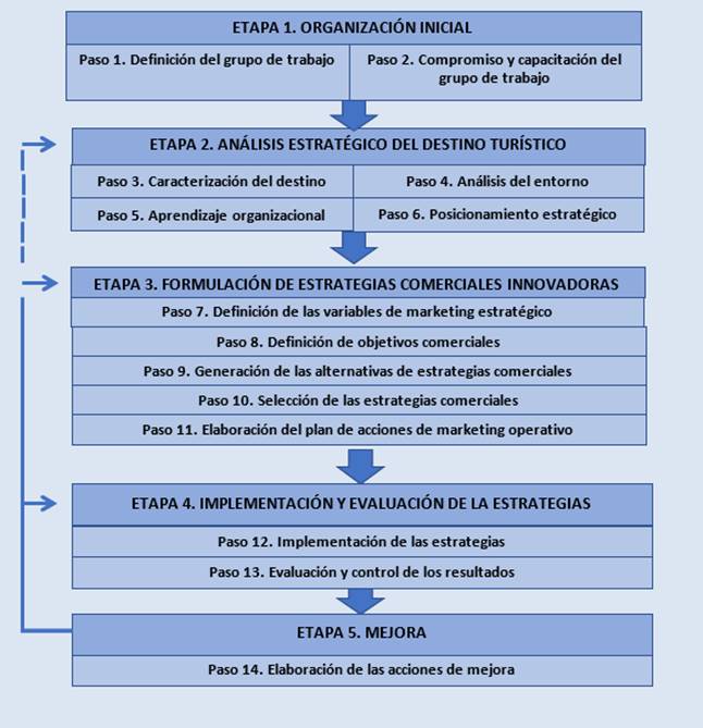 Como resultado del análisis efectuado se propuso una metodología para gestionar la innovación comercial en destinos turísticos, compuesta por cinco etapas y catorce pasos. La propuesta posee consistencia lógica y puede adaptarse al contexto actual y la realidad de cada destino. Todo ello permite disponer de una herramienta apropiada que favorece el desarrollo de la innovación en la comercialización como uno de los componentes fundamentales en el tránsito hacia la gestión inteligente de los destinos turísticos.