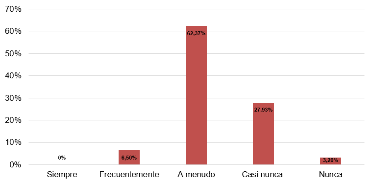 Sobre la frecuencia con la que las personas observan estrategias de promoción de diversos atractivos que se encuentran en la parroquia San Isidro, donde un total de 232 personas reconocieron que a menudo, esto representa un total del 62,37%, mientras que un total de 104 personas comunica que casi nunca, lo que representa un total de 27,93%, por otro lado, un total de 24 personas respondieron que frecuentemente, lo que representa un 6,5%, y por último 12 personas detallaron que nunca, lo que representa un total de 3,2%. Los resultados anteriores evidencian que la parroquia San Isidro suele impulsar estrategias de promoción para dar a conocer todos sus atractivos turísticos, pero aun así deben de amplificar sus promociones en función de su alcance geográfico y en función de los medios de comunicación.