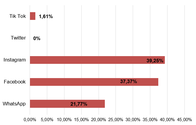 Dentro de la encuesta, sobre qué red social es más adecuada para promocionar los puntos turísticos en San Isidro, con una mayoría total de 146 personas, determinaron que la mejor red social es Instagram, con una representación del 39,2%, mientras que en segundo puesto se encuentra la red social de Facebook, con un total de 139 personas, con una representatividad de 31,9%, en tercer lugar se encuentra WhatsApp, con un total de 81 personas, lo que representa al 21,8% y por último Tik Tok, con un total de 6 personas, lo que representa un 1,6%, tal y como se muestra en la figura 3.