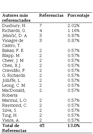 De las 147 referencias de los 12 artículos estudiados, se obtuvo un total de 346 autores, resalta Nancy Duxbury como la autora más prolija y referenciada, Las fuentes más utilizadas por los autores para el desarrollo de este tema fueron los artículos de revistas científicas debido a su alto nivel de calidad académica.