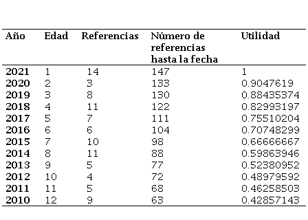 Teniéndose en cuenta que el máximo de utilidad de un artículo es de 1, el cual es el que se obtiene en la referencia del año 2021 y que la semivida, genera una reducción del 50%, es decir de un 0,5. Por ello, de los valores de utilidad, se seleccionan los más cercanos a 0,5, en este caso 0.48979592 valor de utilidad correspondiente al año 2012. Es por ello que se determina que los artículos referenciados alcanzan su semivida a los 10 años de antigüedad, es decir el período durante el cual fue publicada la mitad de la literatura activa circulante referente al tema estudiado.