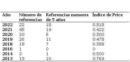 Luego de los cálculos anteriores se procede al cálculo del grado de actualización de las publicaciones, el cual se obtiene mediante el cálculo del índice de Price, este índice permite conocer la cantidad de referencias con antigüedad menor a los 5 años que fueron utilizadas en dicho estudio. Para que el índice indique una mayor actualización debe arrojar valores cercanos a 1. Como se puede observar en la tabla 3, en los años 2022 y 2013 existe un grado de actualización de las referencias medio alto, pues se alcanzan valores de 0.81818182 y 0.76923077 respectivamente. Por otro lado, en los demás años existe un índice de actualización bajo ya que presentan un índice que se encuentra por debajo de 0.5, lo que representa que la mayoría de las referencias de estos años esta desactualizada. Cabe destacar también el año 2014 en el cual se obtiene un grado de actualización medio con un índice de 0.5.