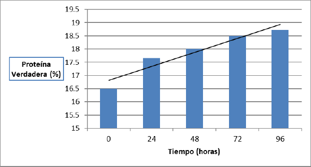 Uno de los aspectos más relevantes de los resultados mostrados es el elevado contenido de proteína de esta leguminosa. La cepa Trichoderma viride M5-2 en la transformación de este sustrato, logra aumentar en 2 unidades porcentuales el valor inicial de proteína verdadera con respecto al tiempo, (Fig. 1), lo que demuestra el potencial del hongo Trichoderma viride M5-2 para el crecimiento sobre estos sustratos fibrosos y con alto contenido en taninos, y otros factores antinutricionales. Comportamiento similar se obtuvo en el procesamiento de los granos de esta especie de leguminosa por las enzimas celulasas de este hongo, la cual permitió desarrollar un proceso fermentativo biológicamente factible tanto con granos enteros como molidos14.