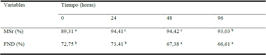 Se tomaron muestras a las 24, 48 y 96 horas, con tres réplicas para cada tiempo y se utilizaron para determinar fibra neutra detergente8, proteína verdadera9 y materia seca residual10.Para el procesamiento de los resultados se realizó un ANOVA de clasificación simple en el sistema estadístico INFOSTAD, versión 1.0 (2008) de la Universidad Nacional de Córdova, Argentina y se establecieron las diferencias entre medias para cada variable en cada tiempo realizando un análisis a posteriori mediante la prueba de Duncan11.