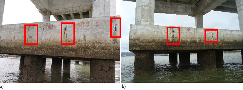 Es de apreciar la existencia del deterioro por corrosión en los aceros de refuerzo en las zonas de marea y salpicaduras en dicho puente (Fig. 1 a y b), lo que confirma la necesidad de conocer el índice de corrosividad de las aguas.