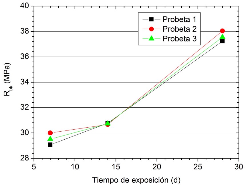 Se determinaron tres valores de resistencia a compresión a tiempos de curado de 7, 14 y 28 d, con inmersión total en agua potable a temperatura de 25 ± 2 0C.40 Los valores de resistencia a compresión (MPa) fueron obtenidos en una máquina de ensayo marca PILOT de fabricación italiana, con fuerza máxima de compresión axial de 2000 kN. Los valores de resistencia a compresión (Rbk) a tiempo de curado de 28 d, sirvieron para la clasificación del hormigón en cuanto a su desempeño por durabilidad.