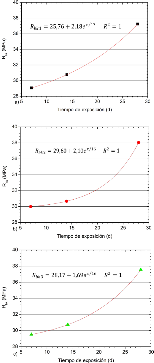 El experimento permitió determinar el tiempo crítico de curado a partir del cual comienza a incrementarse la resistencia a compresión (Fig. 4). Para esto, fue necesario realizar el ajuste de un modelo estadístico matemático basado en una función exponencial creciente