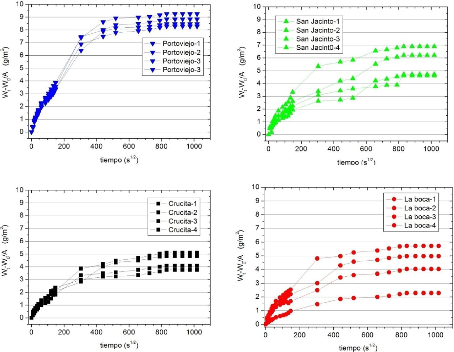 La diferencia en cuanto a los valores de porosidad efectiva se demuestra al observar las cuatro curvas de absorción capilar para cada una de las muestras de hormigón sometidas a las dos aguas, es decir la de mar y la potable (Fig. 5). Se aprecia una mayor inclinación en la absorción capilar para las cuatro muestras de hormigón sometidas al agua potable de Portoviejo. De esta forma, se obtiene un menor tiempo de saturación, representado por el intercepto entre la parte inclinada y la lineal.