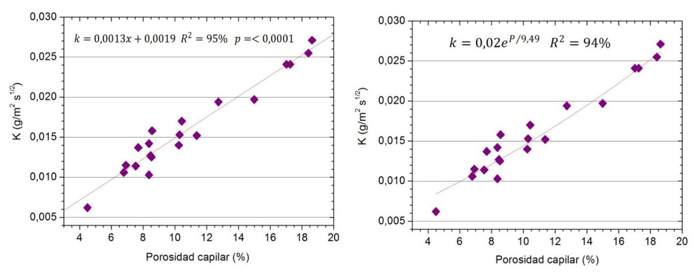 Esto indica una menor resistencia a la penetración del flujo de agua (m) y un mayor coeficiente de absorción capilar (k), lo que trae como resultado un porcentaje de porosidad capilar mayor. En otras palabras, una permeabilidad mayor (Tabla 5).
