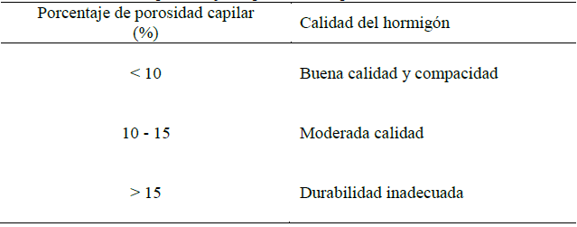 Una metodología muy sugerida por la literatura internacional es la establecida por Fagerlung en 1986, basada en la absorción capilar de agua en función del tiempo y el área circular de la probeta de hormigón en contacto con el agua. Según ella, a partir de una relación entre el coeficiente de absorción capilar y la resistencia a la penetración del flujo de agua, se obtienen los valores de porcentaje de porosidad capilar.32